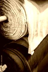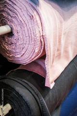 different color textile fabrics in rolls at the factory, shop window, Atelier, etc.