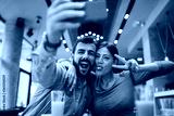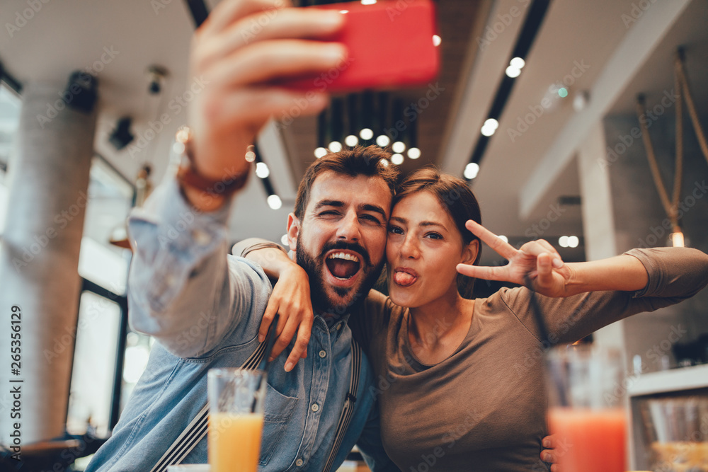 Young happy couple at cafe taking selfie