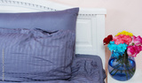 Bedside table with vase of flowers roses and bedroom fresh air. Bed with blue linens, blanket, pillows for comfortable sleep time. Flower interior design and aroma florist concept. Selective focus.