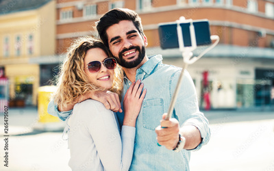Happy couple making a selfie with mobile phone. Dating, love, relationships, lifestyle concept