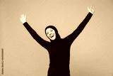 Overjoyed young arabian muslim woman in hijab black clothes doing winner gesture, say Yes isolated on yellow wall background, studio portrait. People religious lifestyle concept. Mock up copy space.