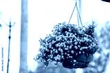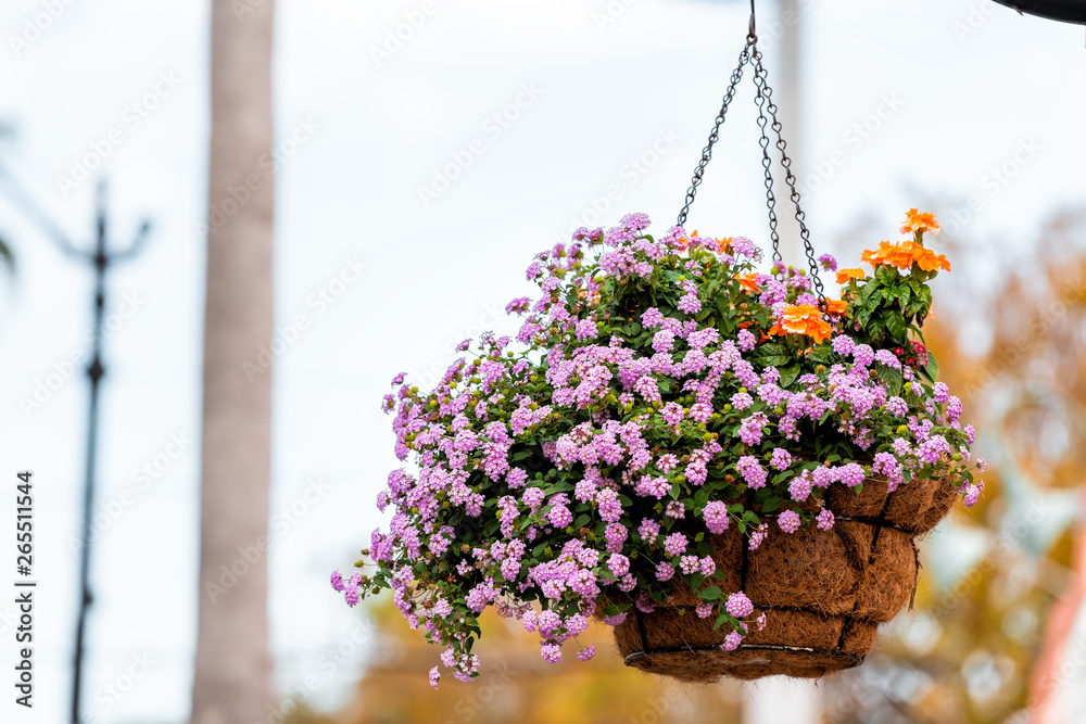 Closeup of colorful purple pink flowers basket hanging on street pole on sidewalk in Venice, Florida, USA