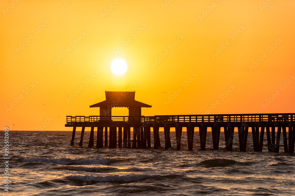Naples, Florida yellow orange sunset closeup in gulf of Mexico with sun and Pier wooden jetty silhouette with horizon and ocean waves