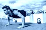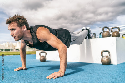 Decline push Up fitness man doing strength training exercise pushup at outdoor gym with elevated legs on jump box.
