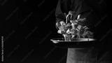 Chef prepares pieces of salmon or trout fillet with green beans in a pan, on a black background for design, recipe book, menu, restaurant or hotel sign, cooking, gastronomy