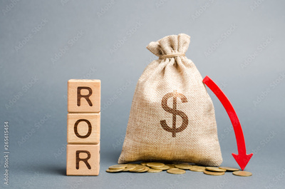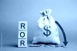 Wooden blocks with the word ROR, money bag and down arrow. Financial ratio illustrating the level of business loss. Return on investment. Recession. Lower profitability and performance