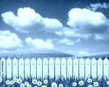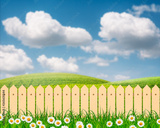 a Green field landscape from backyard with daisy flowers and wooden picket fence