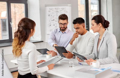 new job, hiring and employment concept - international team of recruiters looking at tablet pc computers while having interview with asian female employee at office