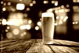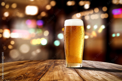 Fresh cold beer in glass and free space for your bottle. Bar interior background
