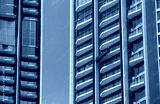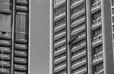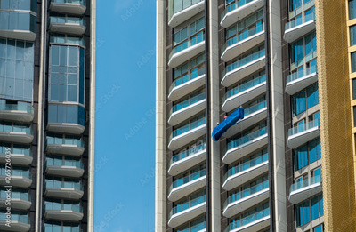 High rise window cleaner with cradle lift. Glass cleaner is working. Dangerous jobs in the building, cleaning and maintenance industries. Cleaning windows service. High risk work. Exterior building.