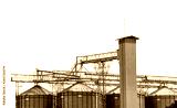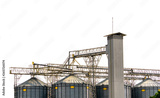 Agricultural silo at feed mill factory. Flat silo for store and drying grain, wheat, corn at farm. Storage of agricultural product. Big tank for store grain. Grain stock tower. Agriculture industry.