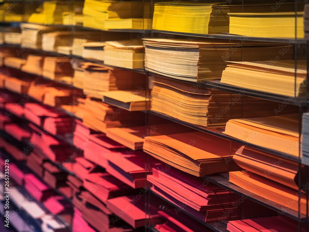 Colourful paper on shelf Stationary shop letter paper and envelope