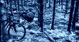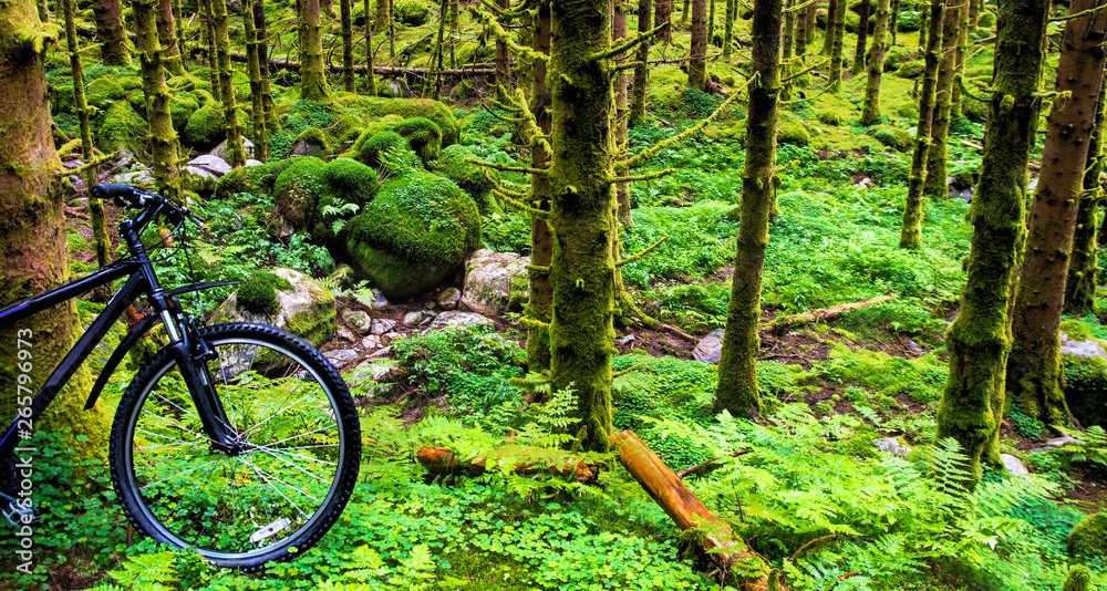 Mountain bike on the background on amazing Norway landscape. Artistic picture. Beauty world. Panorama
