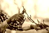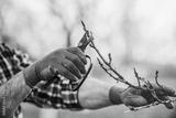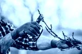 Orcharding. Man pruning tree with a shears in the orchard, close up photo. Hobbies and leisure, agricultural concept