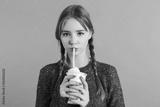 Young pretty girl with two braids in sweater drinking milkshake thoughtfully looking in camera while spending time over pink background