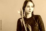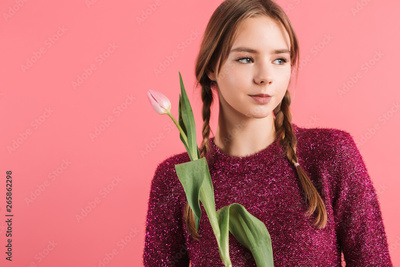 Portrait of young beautiful smiling girl with two braids in sweater holding one tulip in hand while dreamily looking aside over pink background