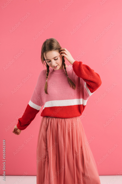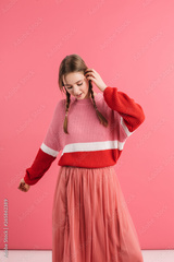 Young beautiful girl with two braids in sweater and long skirt holding hand near head while dreamily dancing spending time over pink background