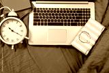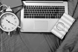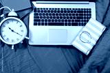Workspace and workplace in bed with internet and laptop at bedroom background. notebook with copy space and top view. Business freelance and lazy weekend work time. Blogger, flat lay