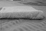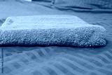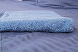 Close up of Blue inn linens and bath towel lying on bed. Hotel service and clean bedroom background. House room and home textile. Copy space and template. Selective focus.