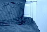 Bed at hotel room. Sleeping time and rest concept. Bedroom at home and soft pillows with blue linens. Selective focus