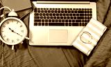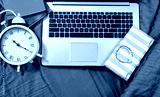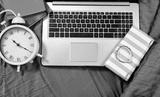 Workspace and workplace in bed with internet and laptop at bedroom background. notebook with copy space and top view. Business freelance and lazy weekend work time. Blogger, flat lay