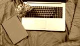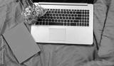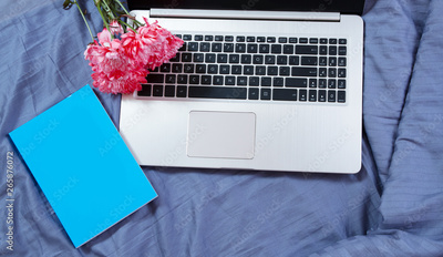 Workspace and workplace in bed with internet and laptop at bedroom background. Flowers and notebook with copy space and top view. Business freelance and lazy weekend work time. Blogger, flat lay