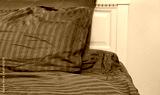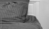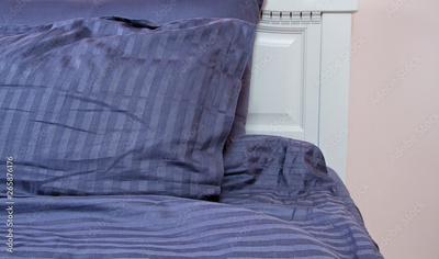 Bed at hotel room. Sleeping time and rest concept. Bedroom at home and soft pillows with blue linens. Selective focus. Banner
