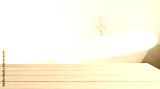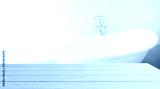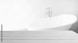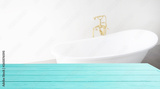 Blue wooden shelf on bathroom background. Wood desk table with top view and copy space near white bath at hotel. Room service and shower spa concept. Selective focus. Banner
