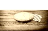 Brown old vintage wooden table with framed checkered tablecloth and pizza cutting board isolated on white background. Thanksgiving day and Cristmas table concept. Top view. copy space. Selective focus