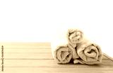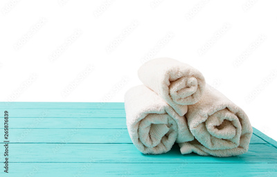 Rolled white towels on blue wooden table isolated on white background. Copy space and top view. Bathroom objects for shower body treatment. Selective focus. Banner