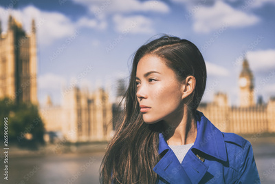 Asian beauty woman fashion at London city, Westminster, Big Ben in the background. Fashion model portrait with serious face. Autumn travel lifestyle.