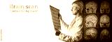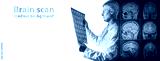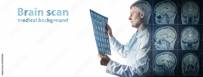 Silhouette of the doctor on the background of CT scan with brain. Isolated on white. Science, medical and education mri concept background.