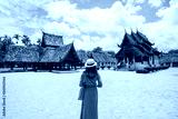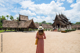 Back view of female tourist visiting the beautiful architecture of Wat Inthrawat temple is one of the finest examples of classic Lanna style architecture in Northern Thailand.