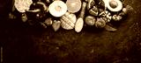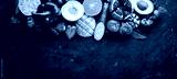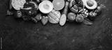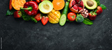 Fresh fruits, vegetables and berries. On a black background. Banner Top view. Free space for your text.