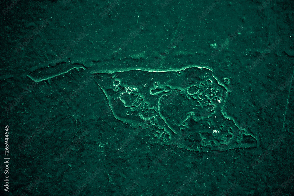 Vintage green background. Rough painted wall of emerald color. Imperfect plane of virid colored. Uneven old decorative toned backdrop of green tint. Texture of emerald hue. Ornamental stony surface.
