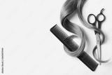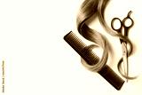 Flat lay composition with light brown hair, comb, scissors and space for text on color background. Hairdresser service