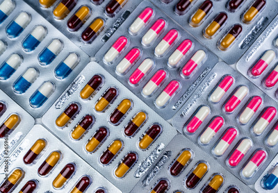 Top view of colorful antibiotic capsule pills in blister pack. Antibiotic drug resistance. Pharmaceutical industry. Pharmacy drug store background. Global health care concept. Antimicrobial capsule.