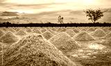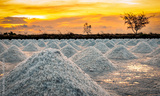 Salt farm in the morning with sunrise sky. Organic sea salt. Evaporation and crystallization of sea water. Raw material of salt industrial. Sodium Chloride. Solar evaporation system. Iodine salt.