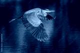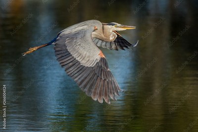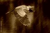 Great blue heron flies over pond