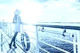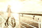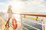 Luxury cruise ship travel elegant tourist woman watching sunset on balcony deck of Europe mediterranean cruising destination. Summer vacation cruiseship sailing away on holiday.
