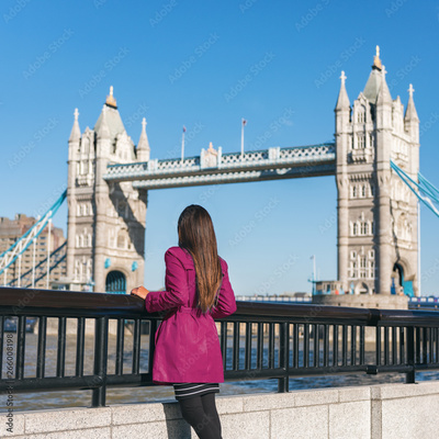 London people lifestyle city tourist woman looking at view of Tower Bridge in red trench coat. Bridge. Stylish elegant lady fashion girl walking enjoying urban modern life.