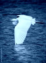 Flying great white egret touches wing on water of pond