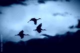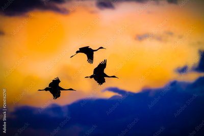 Three Sandhill cranes fly in silhouette against sunset sky in Bosque, New Mexico