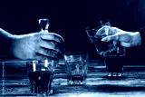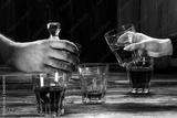 alcoholic drinks in the hands of a man and a woman over a table with full glasses