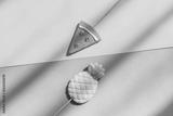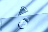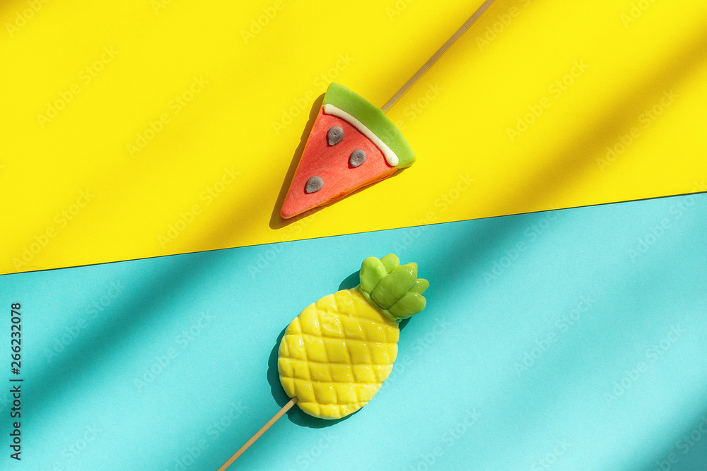 Summer fruits pineapple and watermelon lollipops on stick on blue yellow background with hard light and shadow. Concept Creative Top view Template Greeting card, postcard Copy space.