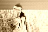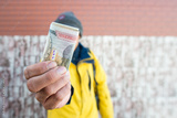Man showing a pile of Nepalese money (thousand rupees banknotes). Nepal currency banknotes.