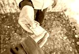 Close up of someone hands giving a roll of Nepalese money to each others. Nepal currency banknotes.