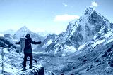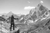 Trekker standing at the edge of the mountain cliff and looking to the beautiful view of Mt.Ama Dablam (6,812 m) and Cholatse (6,440 m) view on the way to Cho La pass, Nepal.