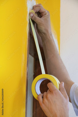 Man putting tape on the wall. The simple step for the quick and easy painting process. Renovation house concept.