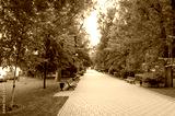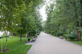 Green alley with benches in urban park